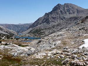 Soon you leave the last of the trees behind and ascend through a rocky landscape on moderate grade to Piute Pass (11,423-ft.), 4.8 miles from the trailhead. From the pass panoramic views extend west across Humphrey Basin to the distant peaks rising above the western side of the South Fork of the San Joaquin Valley. To the south is Muriel Peak (12,937-ft.), Mt. Goethe (13,264-ft.) and the summits along Glacier Divide. To the north the distinctively shaped Mt. Humphrey (13,986-ft.) looms over the other peaks. On the eastern side of the pass Mt. Emerson and Peak 12691 tower above the upper end of the North Fork valley. Piute Lake and Loch Leven Lake shimmer on the valley floor, set amid a backdrop of peaks rising to the southeast.