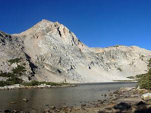 At 2.3 miles the trail reaches the basin, curves to the northwest and shortly arrives at the northeast end of Loch Leven Lake (10,743-ft.). The pretty lake is cradle in a granite basin. The jagged crags of Peak 12691 tower over the lake to the south and the steep granite slopes of Mt. Emerson rise to the north. Looking to the northwest, the saddle on the ridge at the end of the valley is Piute Pass.