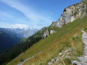 At 5.4 miles the grade briefly abates as the trail curves around a minor ridge. Beyond the ridge the path descends on moderately-easy grade along steep slopes, crossing several rockslides. The section of the trail is accompanied by great views of the peaks rising above the Gadmertal (Gadmer Valley) to the south.