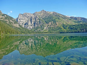 Past the junction the trail reaches the high point on the loop around the lake and then curves to the northeast high above the lake’s north shore. The brushy slopes along the trail are filled with wildflowers in season. A short steep drop soon moderates as the trail crosses Death Canyon Creek, which runs into Phelps Lake, at 3.6 miles.
