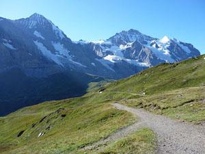 At 4.4 miles, where continued travel along the top of the moraine is no longer safe, the trail turns right (west), drops off the moraine wall and descends steeply through pretty meadows. The Monch and the Jungfrau tower overhead. To the west views extend to the peaks rising above the Lauterbrunnen Valley.