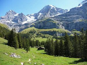 Follow the trail, covered with roots, as it drops through trees on moderate to moderately-steep grades toward the valley floor. Soon the trees give way to beautiful meadows. A short descent leads to Biglenalp at 6.0 miles, situated along a pretty stream. The meadows around Biglenalp enjoy gorgeous views of the Eiger, Monch and the Eiger Glacier. The Jungfrau looms overhead. Across the valley, waterfalls cascade down clefts in the rugged walls along the base of the Jungfrau. This is a great spot for a picnic or to take a break.